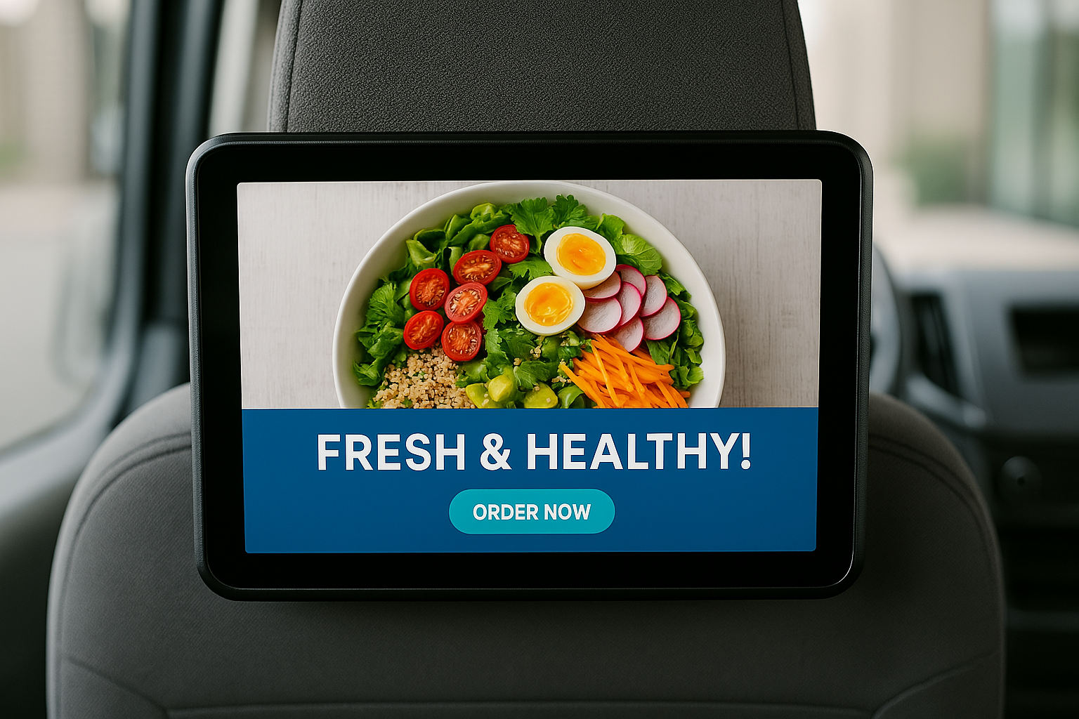 Full-Screen Video Ads displayed on high-resolution tablets mounted on the back of each seat